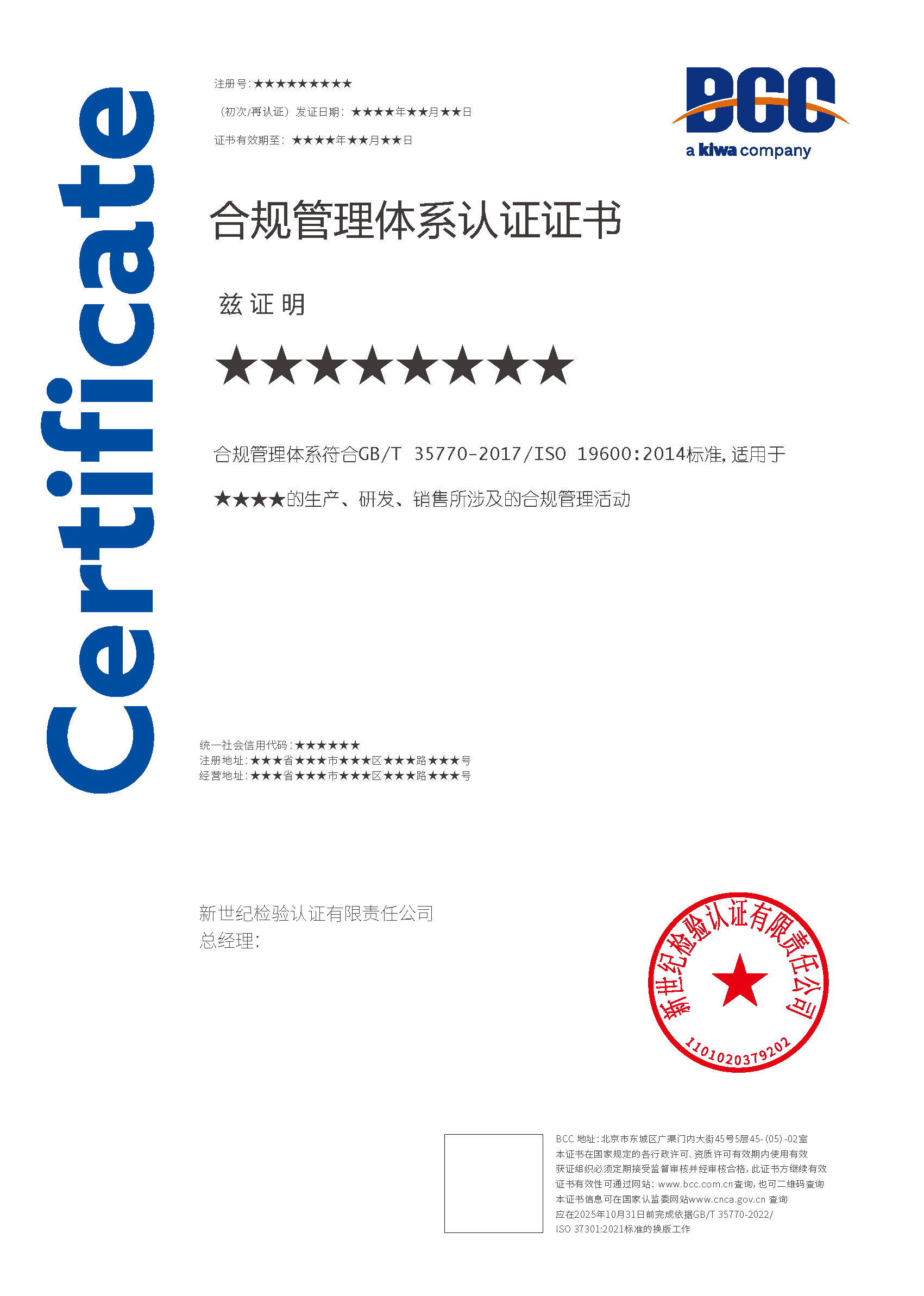 依據(jù)以下標(biāo)準(zhǔn)頒發(fā)合規(guī)管理體系(CMS)認證證書: