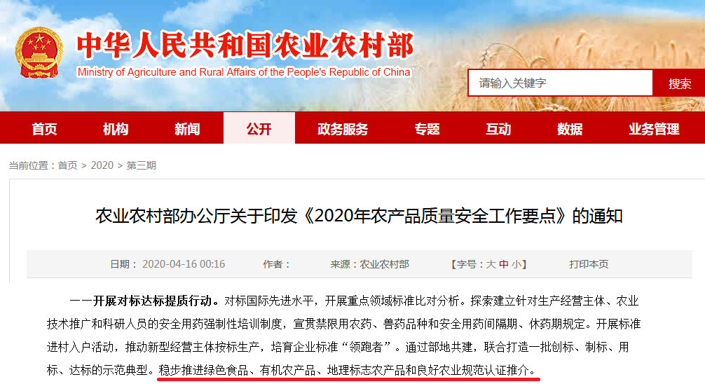 通知對于“加強(qiáng)綠色食品、有機(jī)農(nóng)產(chǎn)品、地理標(biāo)志農(nóng)產(chǎn)品認(rèn)證和管理,實(shí)施地理標(biāo)志農(nóng)產(chǎn)品保護(hù)工程,培育打造200個(gè)地理標(biāo)志農(nóng)產(chǎn)品。”的描述,要全面提高農(nóng)產(chǎn)品質(zhì)量安全水平。