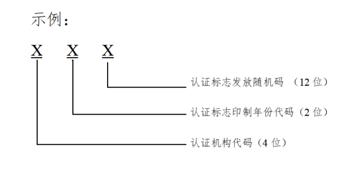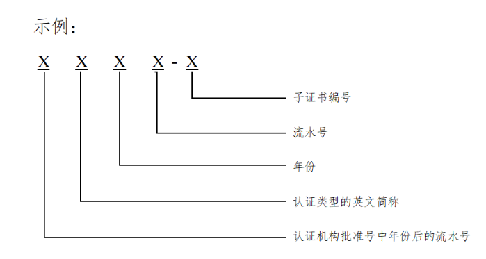 內(nèi)資認證機構(gòu)認證證書編號為該機構(gòu)批準號的3位或4位阿拉伯數(shù)字流水號;外資認證機構(gòu)認證證書編號為F+該機構(gòu)批準號的2位或3位阿拉伯數(shù)字流水號。