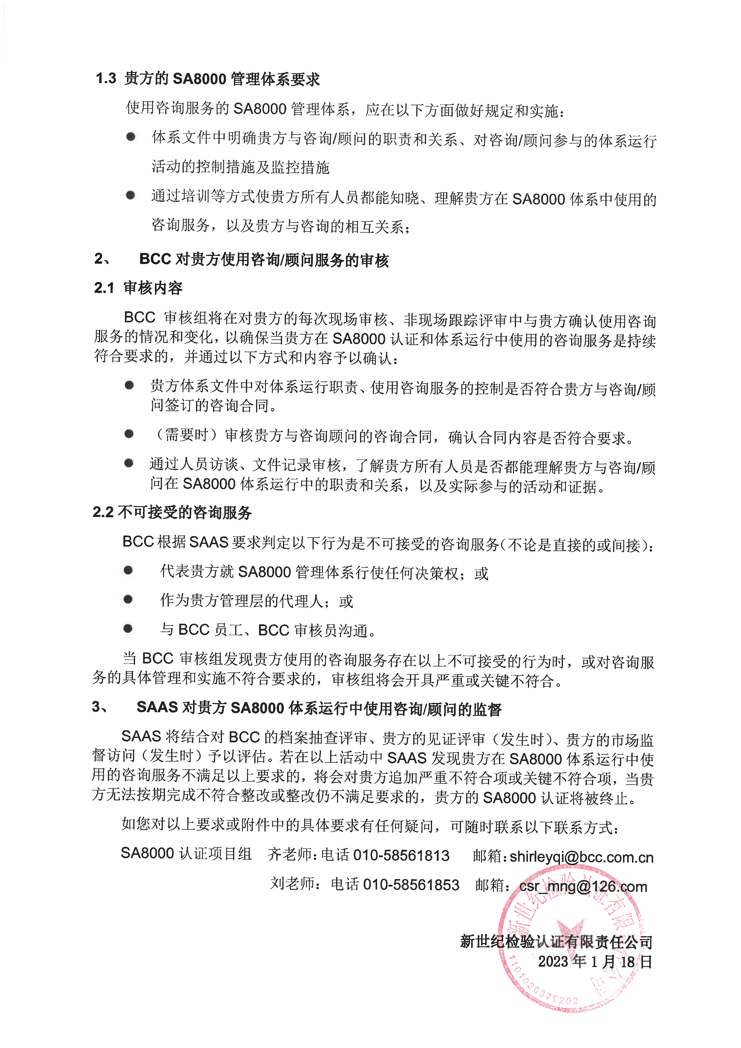 該文件中對認(rèn)證機(jī)構(gòu)、SA8000已獲證客戶、新申請SA8000認(rèn)證的組織都提出了更具體的要求,這些要求將在2023年2月1日實施。以下就該文件中與貴方有關(guān)的內(nèi)容予以說明告知,BCC審核組也將自2023年2月1日開始在審核中向貴方了解、收集、確認(rèn)以下信息,請貴方提前知悉: