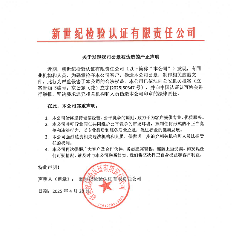 近期,新世紀(jì)檢驗認(rèn)證有限責(zé)任公司(以下簡稱 “本公司 ” )發(fā)現(xiàn),有同業(yè)機構(gòu)和人員,為惡意搶奪本公司客戶,偽造本公司公章,制作相關(guān)虛假文件。此行為嚴(yán)重侵害了本公司的合法權(quán)益。本公司已依法向公安機關(guān)報案(立案告知書編號: 京公東(花)立字[2025]50347號),并向中國認(rèn)證認(rèn)可協(xié)會進行舉報,堅決要求追究相關(guān)機構(gòu)和人員偽造本公司印章的法律責(zé)任。