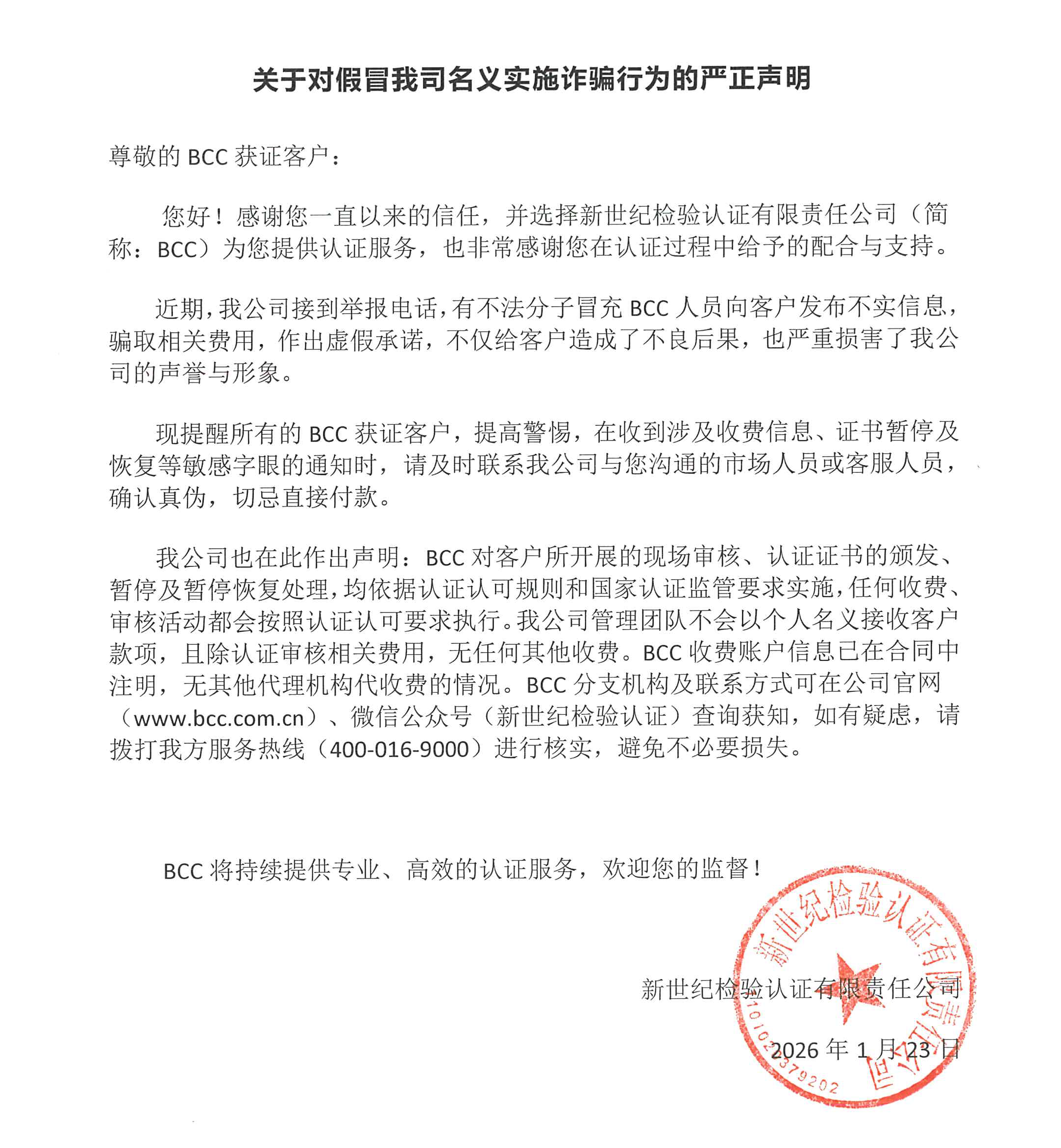 我公司也在此作出聲明:BCC對客戶所開展的現(xiàn)場審核、認證證書的頒發(fā)、暫停及暫?;謴吞幚恚罁?jù)認證認可規(guī)則和國家認證監(jiān)管要求實施,任何收費、審核活動都會按照認證認可要求執(zhí)行。我公司管理團隊不會以個人名義接收客戶款項,且除認證審核相關(guān)費用,無任何其他收費。BCC收費賬戶信息已在合同中注明,無其他代理機構(gòu)代收費的情況。BCC分支機構(gòu)及聯(lián)系方式可在公司官網(wǎng)(m.dongtejf.com)、微信公眾號(新世紀檢驗認證)查詢獲知,如有疑慮,請撥打我方服務(wù)熱線(400-016-9000)進行核實,避免不必要損失。
